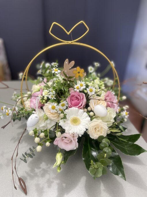 Különleges, fém virágtartóba tűzőtt virágdísz, készlettől függően vegyes virágokból, pasztell színben.